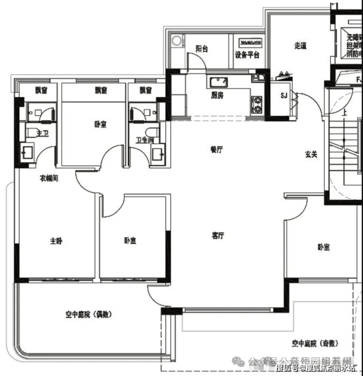 洋房建面约143㎡4房2卫,4开间朝南,整体南向开间约14.5米,客厅开间约5m,主卧套房,北向生活阳台,分奇、偶数层,区别主要在于空中庭院。