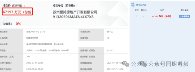 今年7月土拍中,苏州星鸿(星河&天鸿伟业)以底价6.72亿拿下,成交楼面价14400元/㎡。