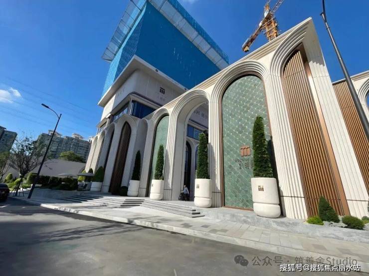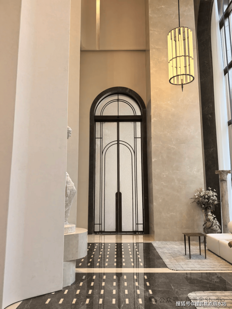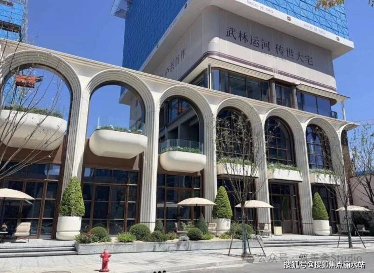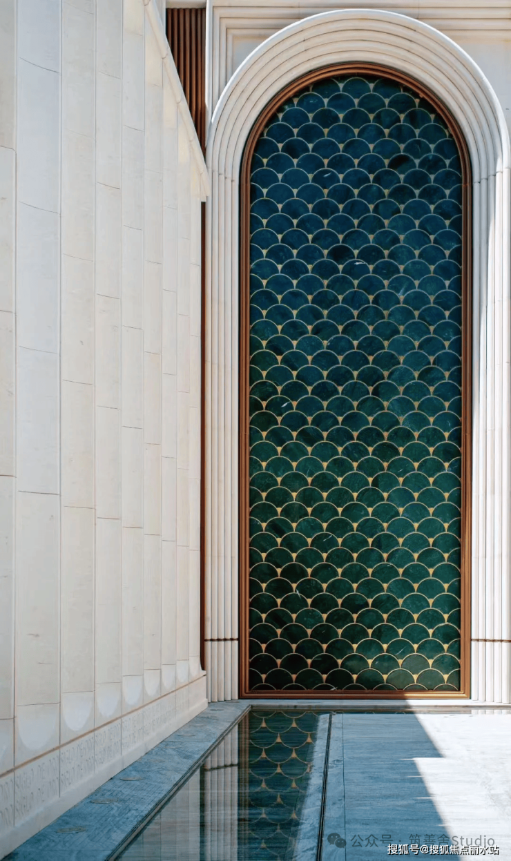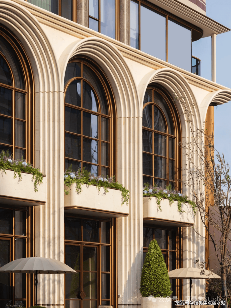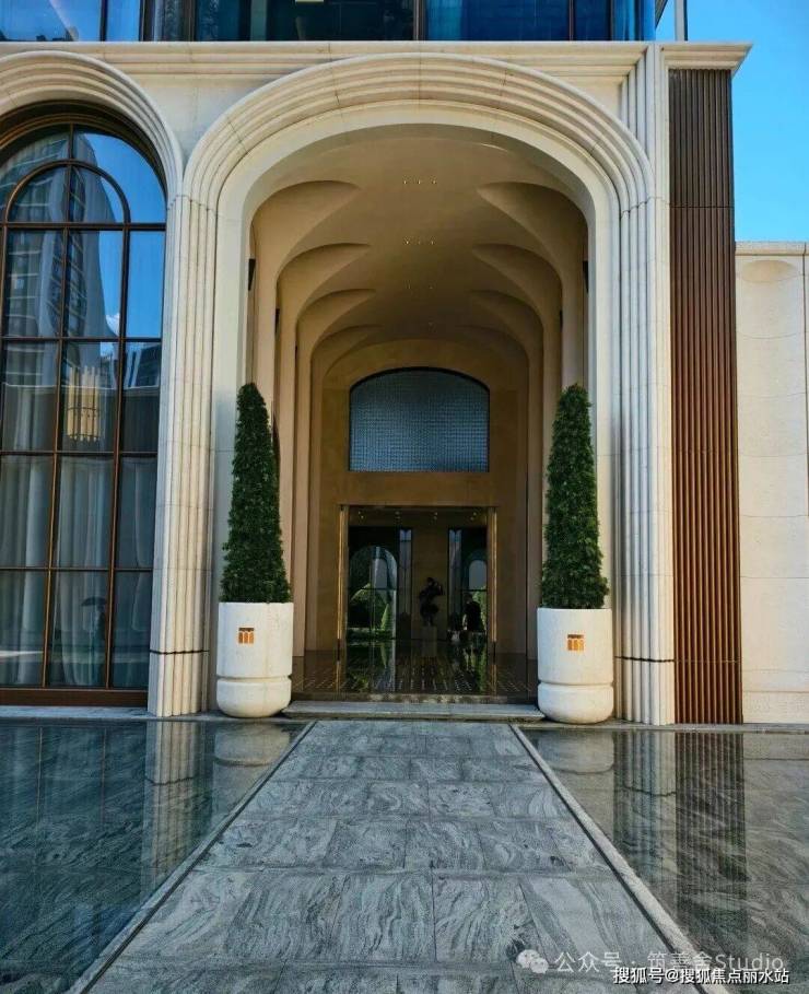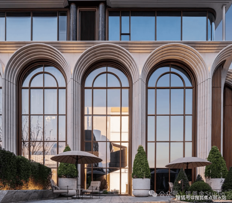 一整排连续的石材拱券,以约12米的超高姿态,气势恢宏地贯穿整个主入口,并沿着京杭大运河一路延伸,尽显磅礴气势。九米设计以“意式拱券”与“斯卡帕叠级”为设计语言,匠心打造了一座“漂浮于运河之畔”的地标建筑。其基座设计高达约11.5米,精选石材材质,巧妙融入西方古典拱券元素,并运用叠级手法,层层递进,极大地增强了空间层次感,营造出鲜明的欧式建筑秩序感,奠定了庄重典雅的基调。