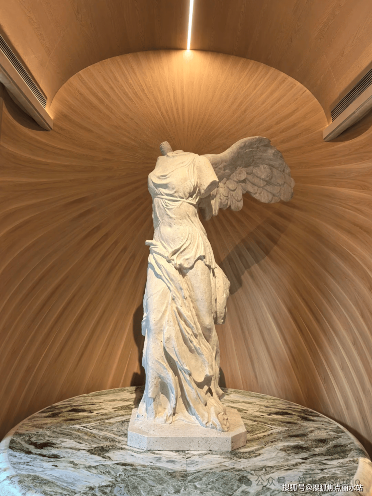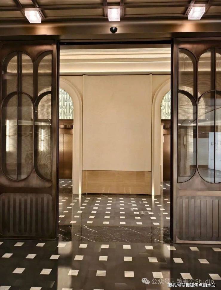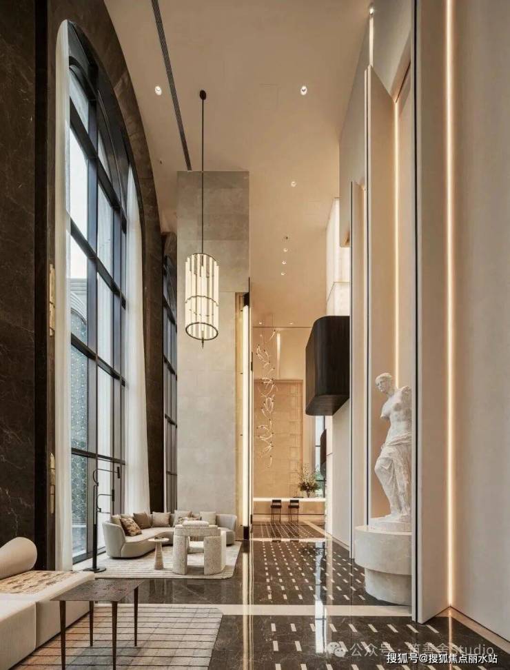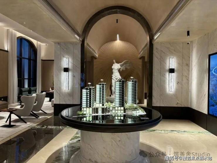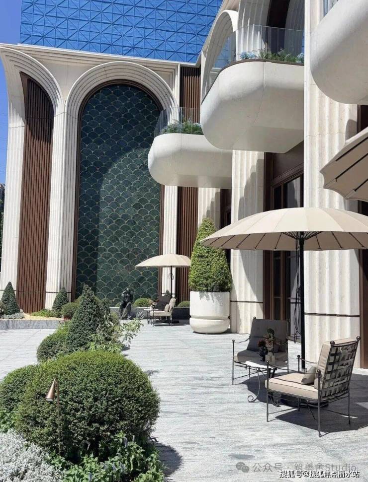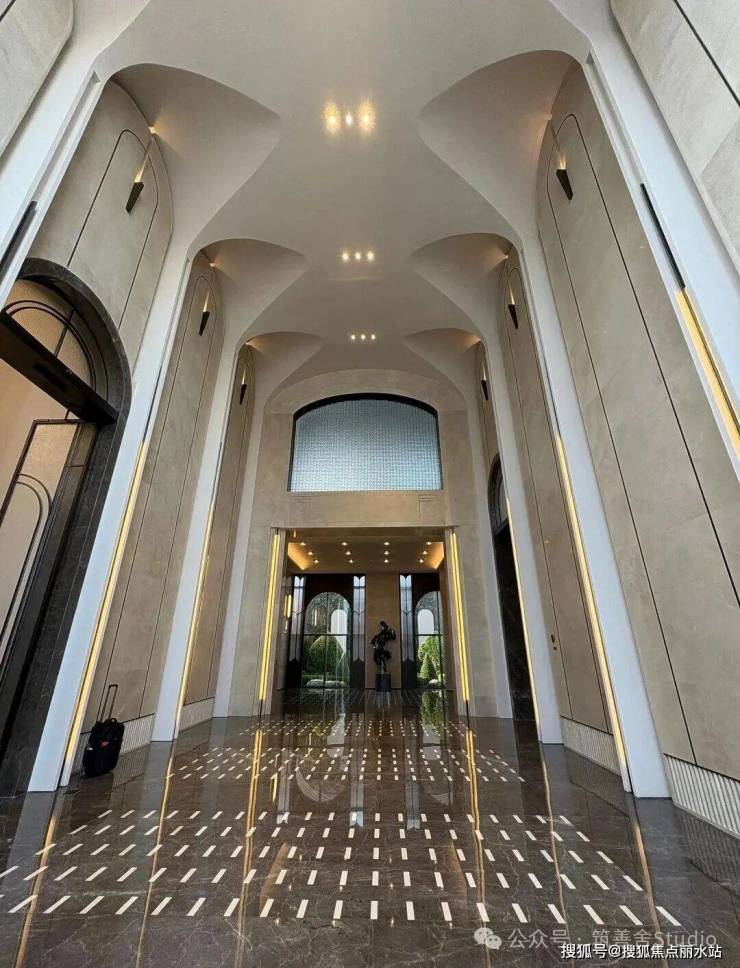 一整排连续的石材拱券,以约12米的超高姿态,气势恢宏地贯穿整个主入口,并沿着京杭大运河一路延伸,尽显磅礴气势。九米设计以“意式拱券”与“斯卡帕叠级”为设计语言,匠心打造了一座“漂浮于运河之畔”的地标建筑。其基座设计高达约11.5米,精选石材材质,巧妙融入西方古典拱券元素,并运用叠级手法,层层递进,极大地增强了空间层次感,营造出鲜明的欧式建筑秩序感,奠定了庄重典雅的基调。