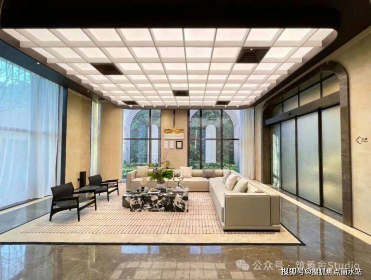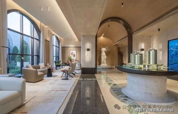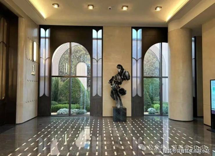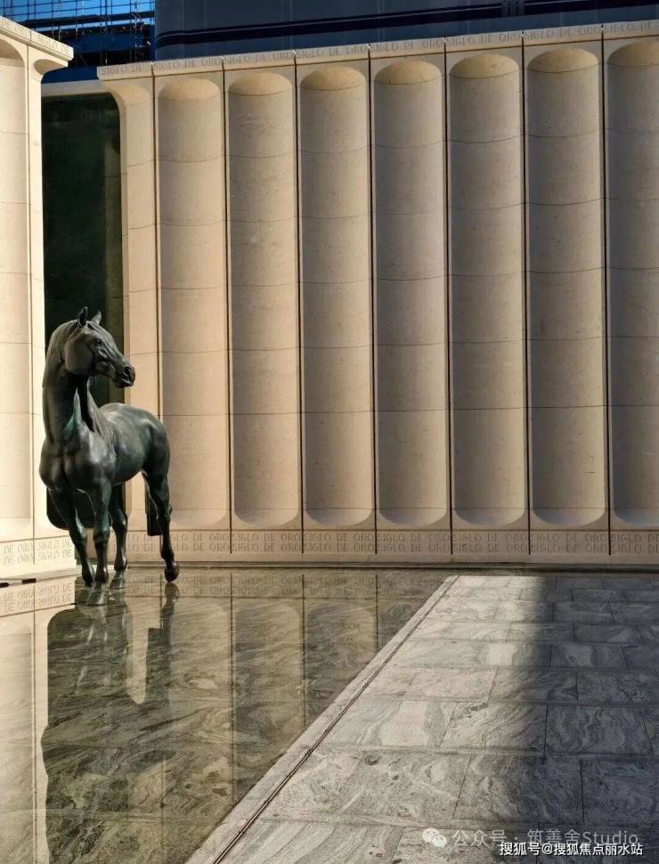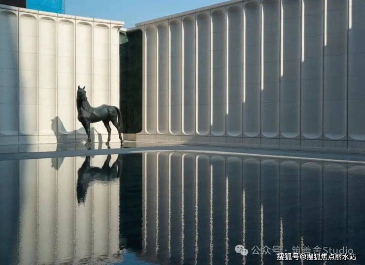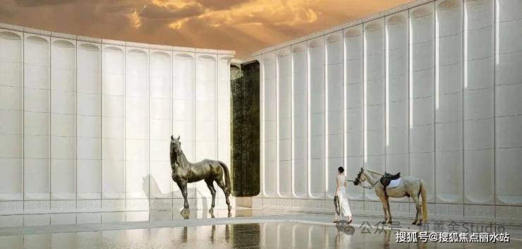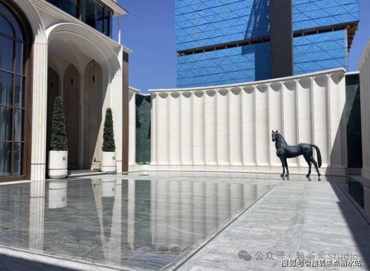 穿过高达12米的宏伟大门,眼前豁然开朗,呈现出一处「光影水院」。水院两侧耸立着8米高的景墙,通体采用名贵的西班牙贝金米黄石材精心构筑,据说造价逾500万元。水院中厅内,由当代艺术家王从义匠心独运设计的马匹艺术装置,整个水院显得干净与艺术。这也是新手法,偌大的水院一株植物都没有,就靠水面和雕塑镇住整个场域。景观设计由卓时设计(ZSD)。