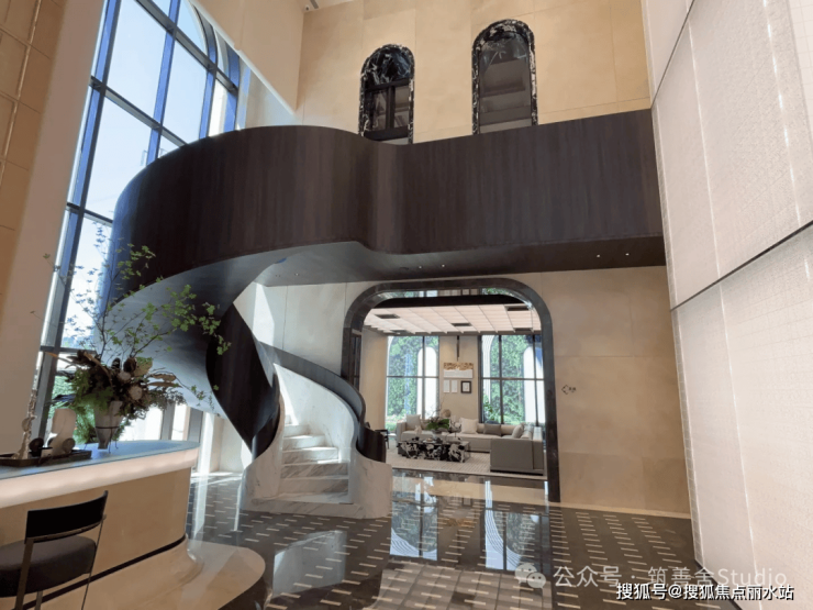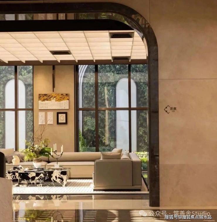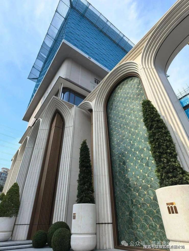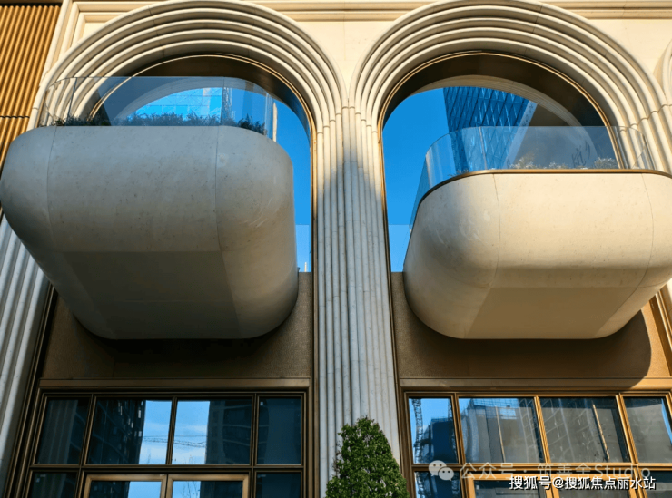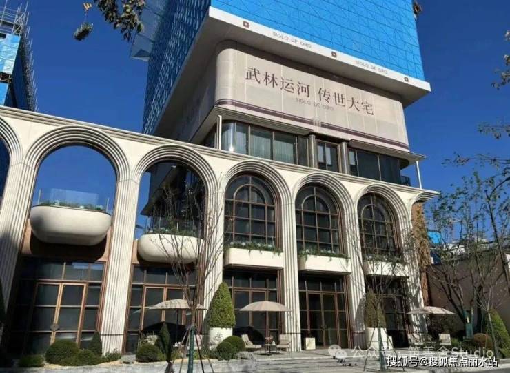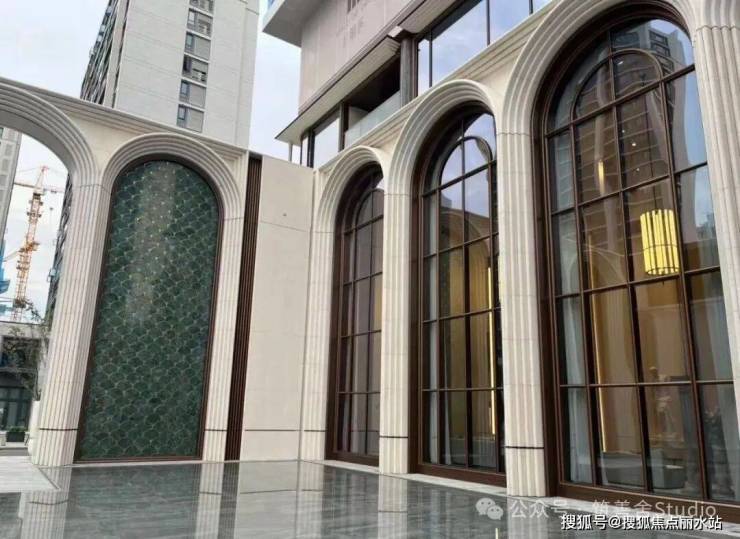 大家·咏印明庐的封面魅力,不仅在于其颠覆性的立面美学,更在于其沿街面的震撼视觉冲击。一排连续的石材拱券,以约12米的宏伟高度,延展至整个主入口及京杭大运河沿线。每一拱券均采用斯卡帕叠级手法,五层石材错落有致,营造出强烈的韵律与秩序感,如古典交响乐般恢弘有力,赋予整个楼盘更浓郁、更立体的美感。行人至此,无不驻足拍照,感叹其震撼。有人称其为“一眼沦陷”的楼盘,美得令人心醉。