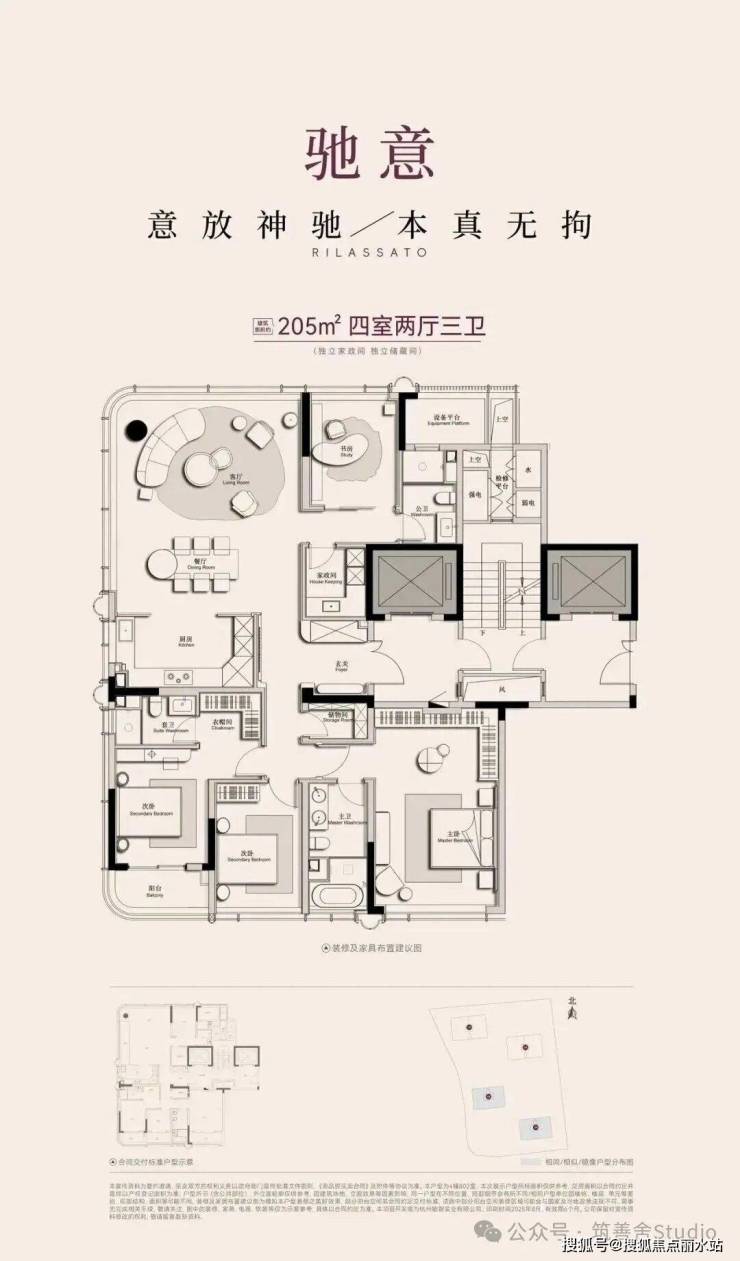 规划4幢小高层,户型多样,从205-245㎡平层到310-380㎡顶跃,层高3.15-3.3米,空间开阔。270度曲面玻璃与古铜色金属线条相得益彰,最大化引入运河景致;动静分区明确,主卧套房配备独立衣帽间与卫浴,尽显奢华。