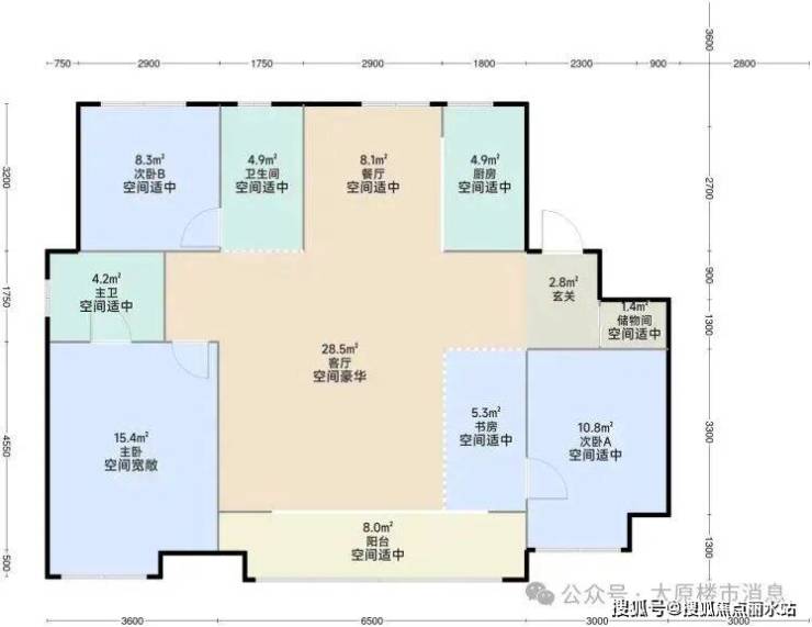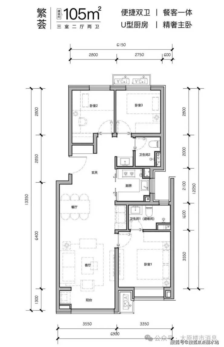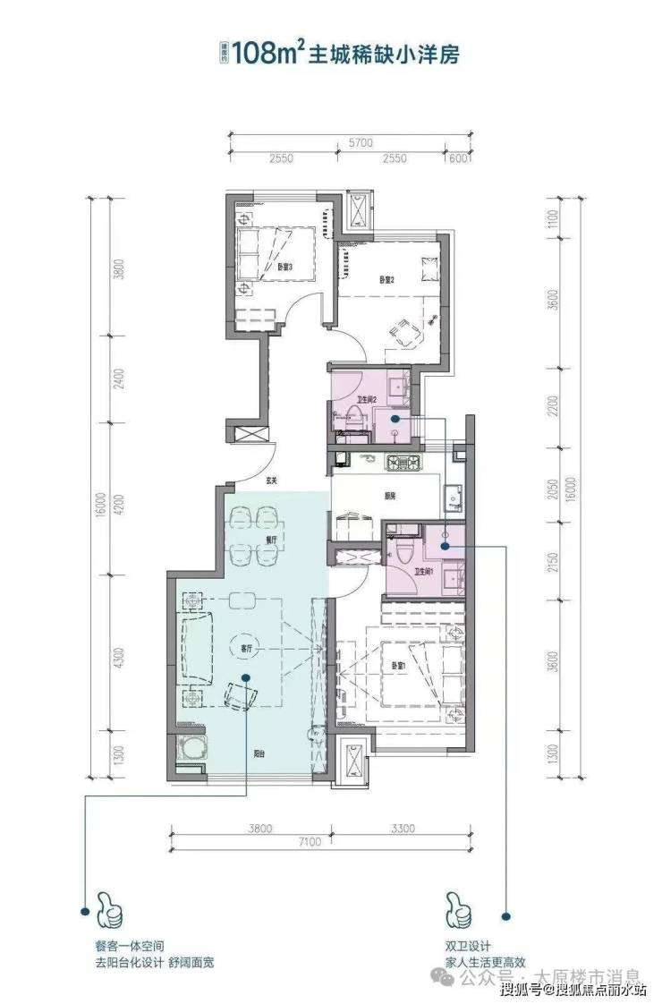 万科悦都荟,105平户型,设计为三室两厅两卫。南北大通透客厅和主卧朝南,两个卧室朝北。客厅开间3.55米,主卧12平米左右。厨房和主卧带的卫生间,有窗户。朝北两个卧室面积稍微小一些。因为南侧无遮挡,采光会很好。