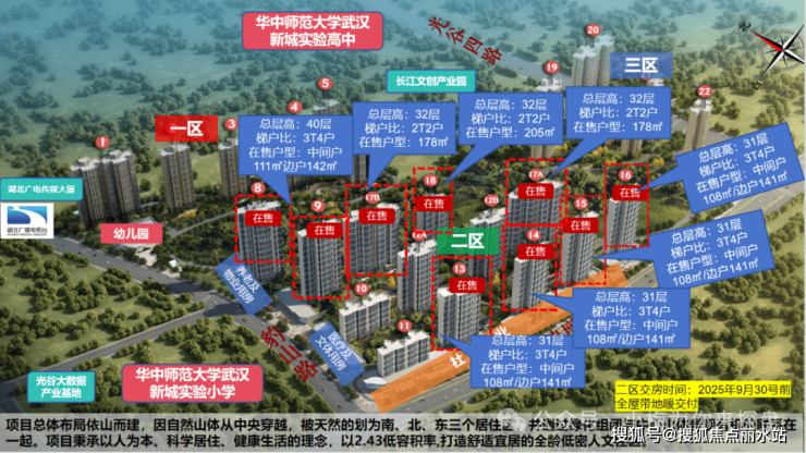 整个项目一区、三区已交付,二区预计2025年9月30日前交付。该小区整体得房率优化后95%-105%。随着湖北广电传媒大厦的全面启用,广电集团全部搬迁至光谷东。长江广电光谷家作为湖北广电传媒基地的住宅项目,也将迎来大批职工入住。所以这里的业主圈层更加纯粹。