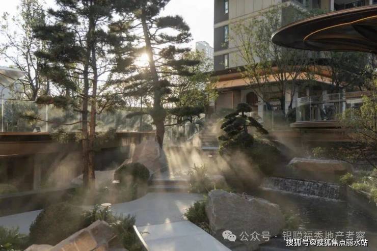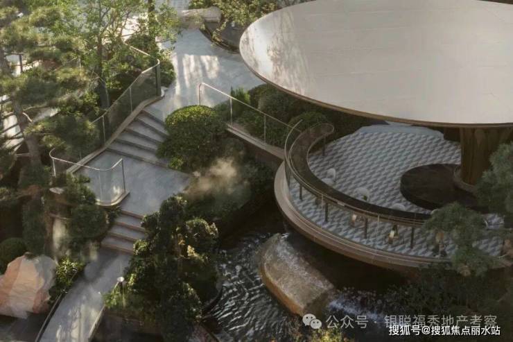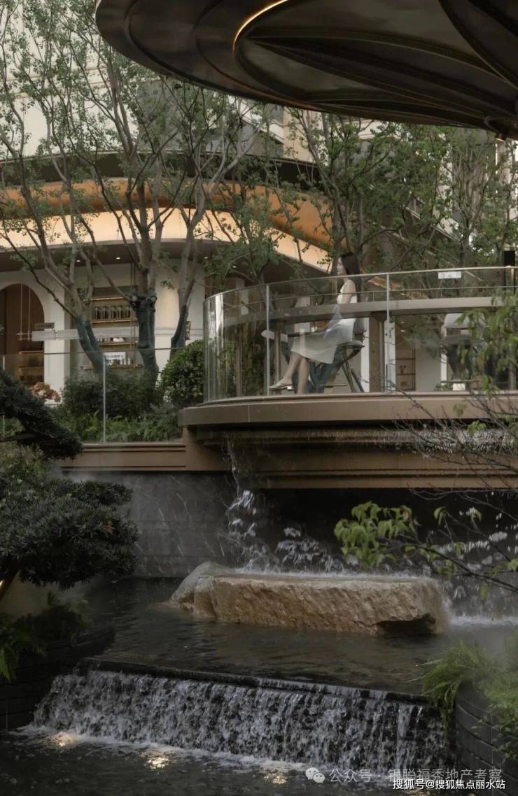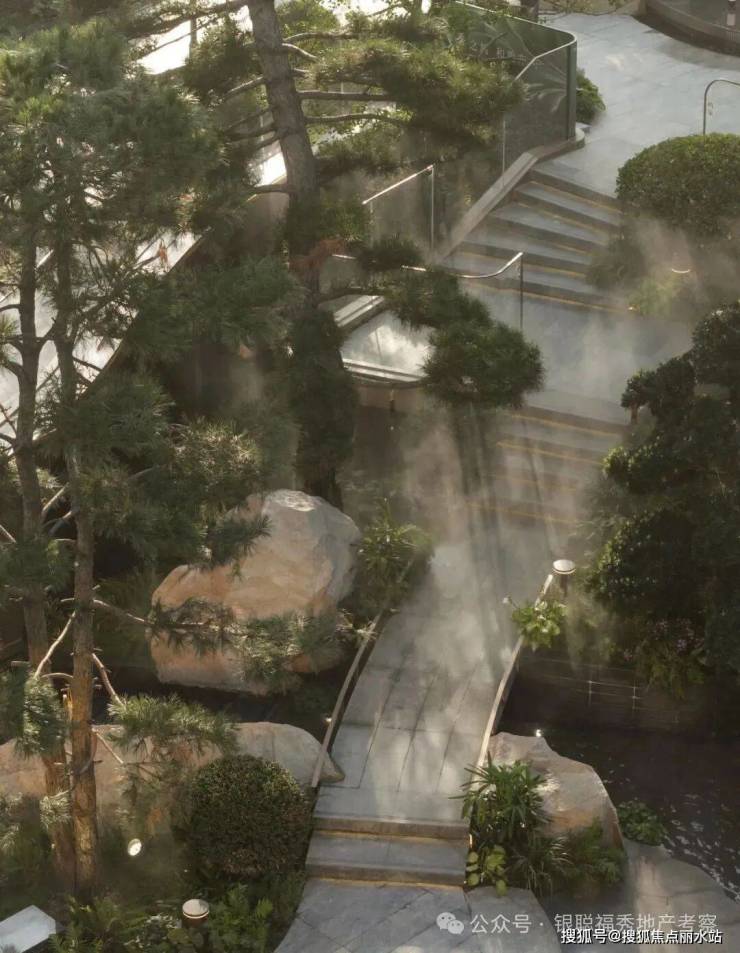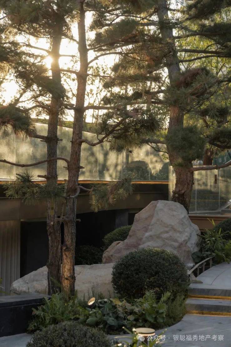 拾阶探幽,松枝垂探,俯仰叠水层阶。引山为屏,活水为脉,方寸间气象万千。几何光影映照中庭,古意今韵,共构沉浸新境。
