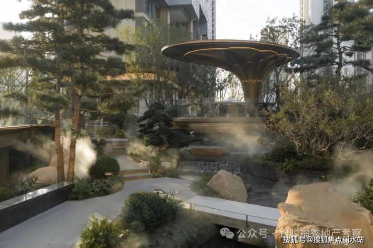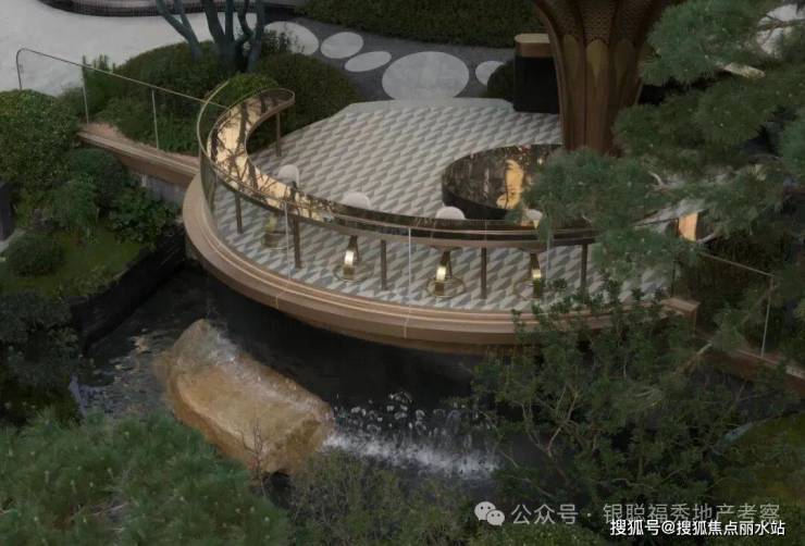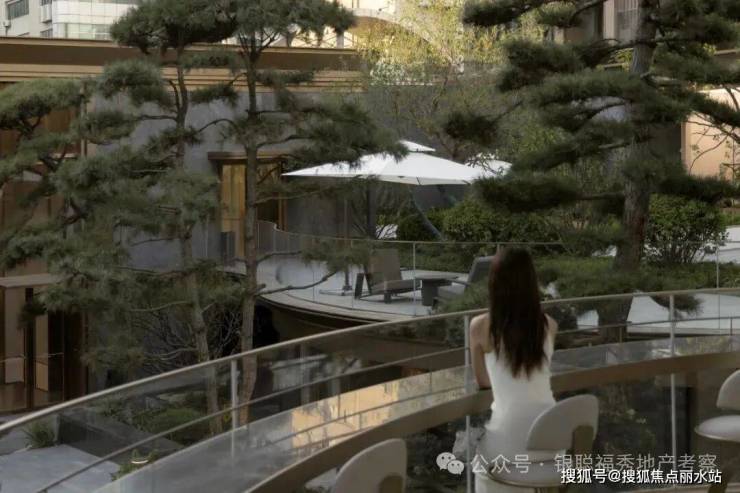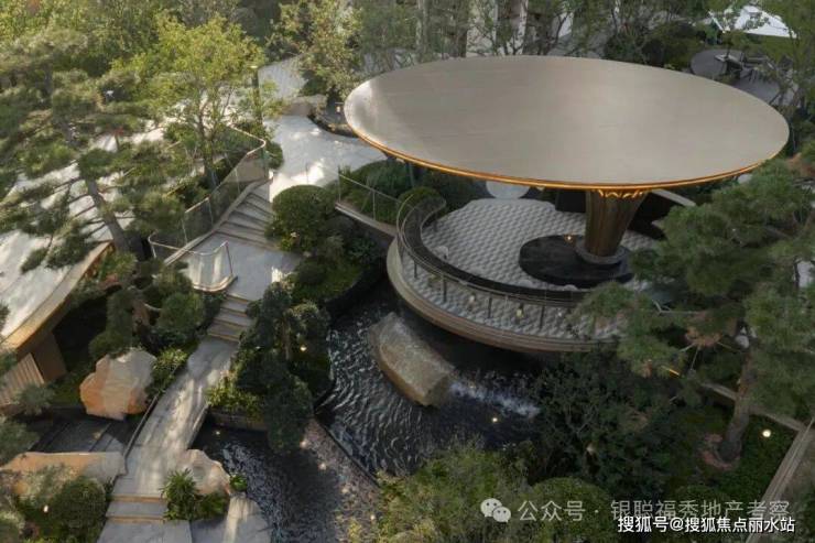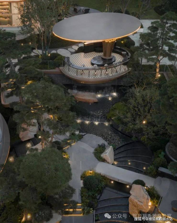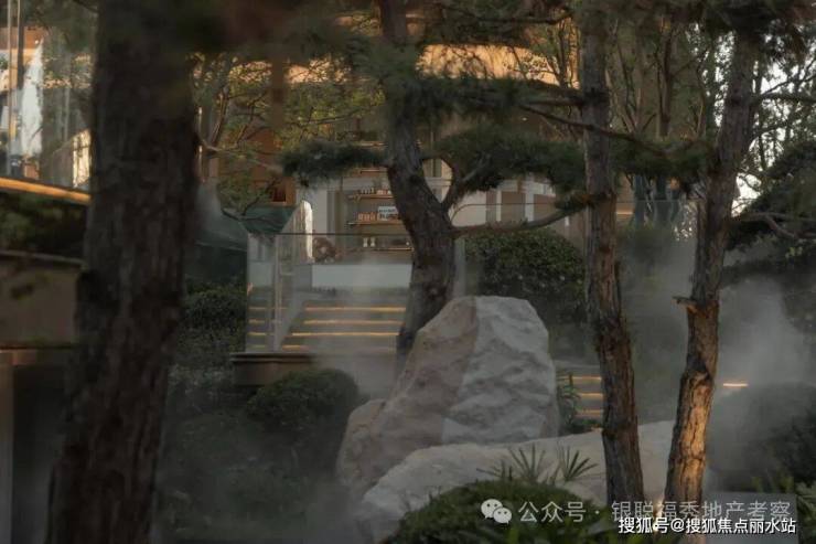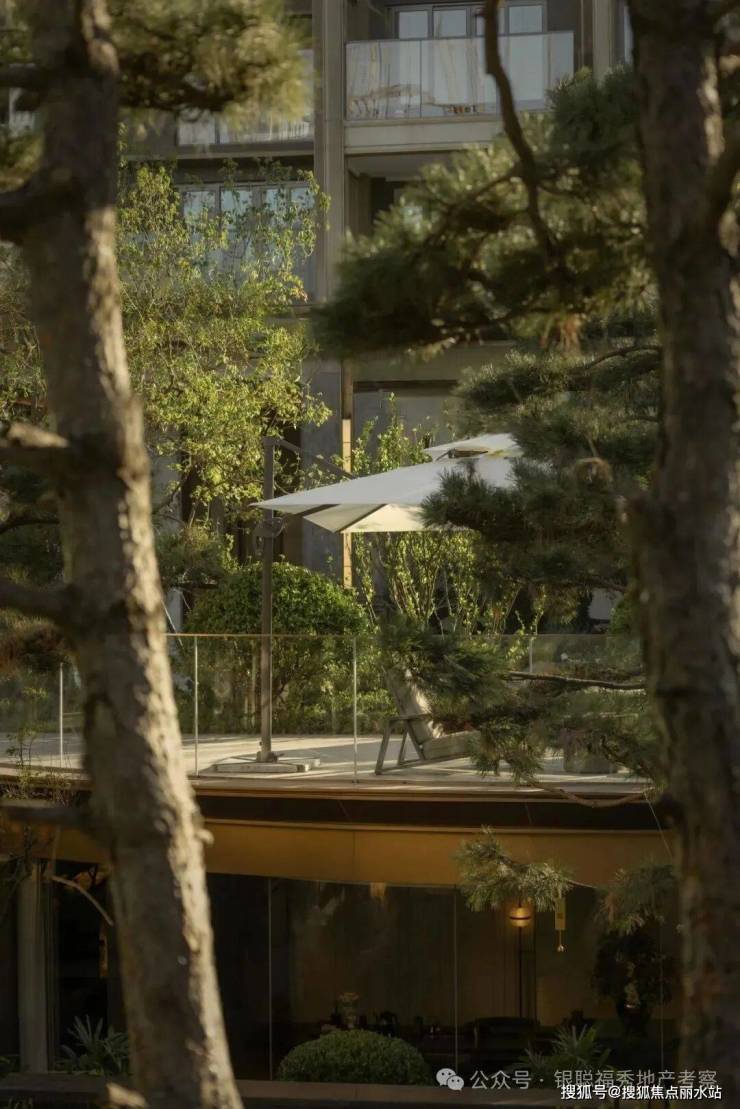 拾阶探幽,松枝垂探,俯仰叠水层阶。引山为屏,活水为脉,方寸间气象万千。几何光影映照中庭,古意今韵,共构沉浸新境。