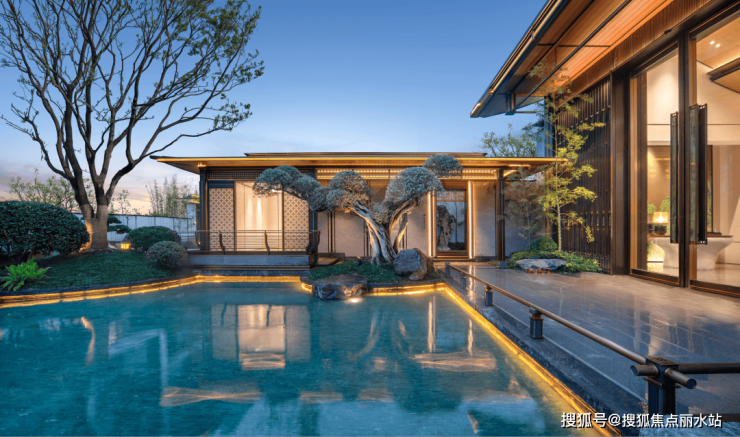 下沉式庭院的景观,则是另一番意趣:四水归堂的造型,不仅有一道飞瀑倾泻而下,而且中庭也是植入名木鸡爪槭和百年五针松,清雅、灵动!