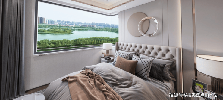 主卧空间亦是对常规户型的超越。约22㎡的奢阔尺度内,独立卫生间、预留的衣帽空间均从容布局,保障了主人的私密与尊贵。特别设计的270°转角飘窗,以无可比拟的视野,将湖光水色变为私属背景。这里不仅是休憩的场所,更是一个可供思考、放松、享受二人世界的浪漫空间,让每一天都始于美景,归于宁静。