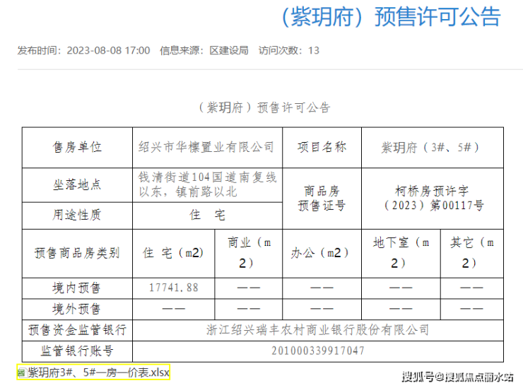 8月8日,柯桥区人民政府网站发布公告:元垄紫玥府3幢、5幢领出新的预售许可证。