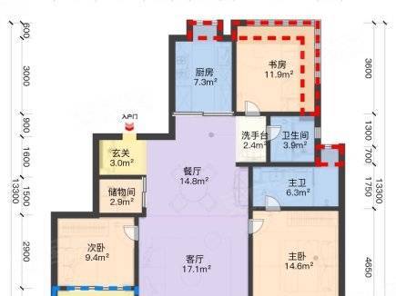建面约 130㎡四房两厅两卫:总价约 1727-1872 万,四开间朝南布局,LDKB 一体化设计,客餐厅连通宽景阳台,家政空间独立划分,主卧配备步入式衣帽间与明卫,适配三代同堂或二孩家庭全周期需求。