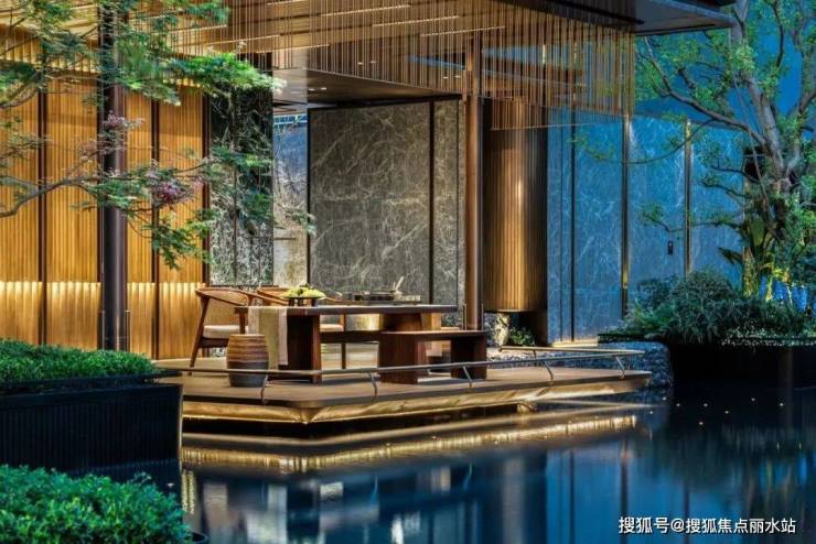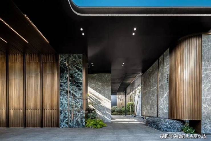 福鼎黑仿石点缀古朴黑山石,大气而贵重的第一视角,进口意大利的普拉达绿大理石打造山石叠瀑,搭配名贵罗汉松及红枫蜜桔,兼顾层次与隐奢气场。