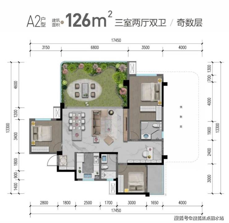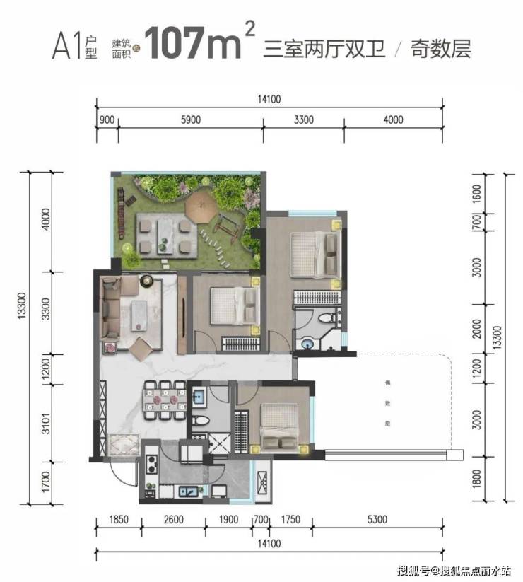 约26㎡空中花园:外挑约4m,约6m挑高空中花园,270°环幕视野,一方天地,满足三代人不同森活意趣。