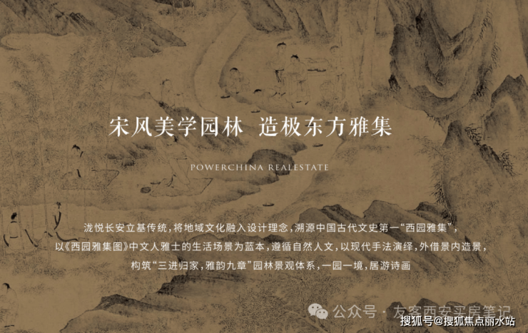 把宋代的西园文人盛会雅集场景融入社区,富有层次感的景观布局,融合了小桥流水、亭台楼榭、松石等中国山水画元素,复现宋代至雅时光。