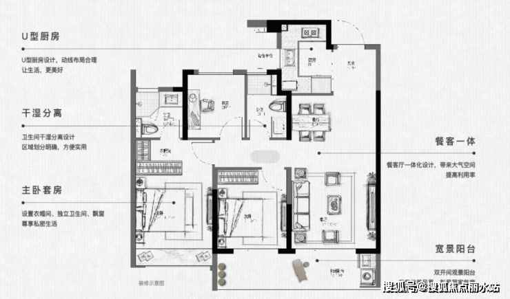 U型厨房设计,餐客厅一体化设计搭配双开间观景阳台,带来大气空间, 营造幸福满满的生活场,主卧套房设置衣帽间,透着改善风。