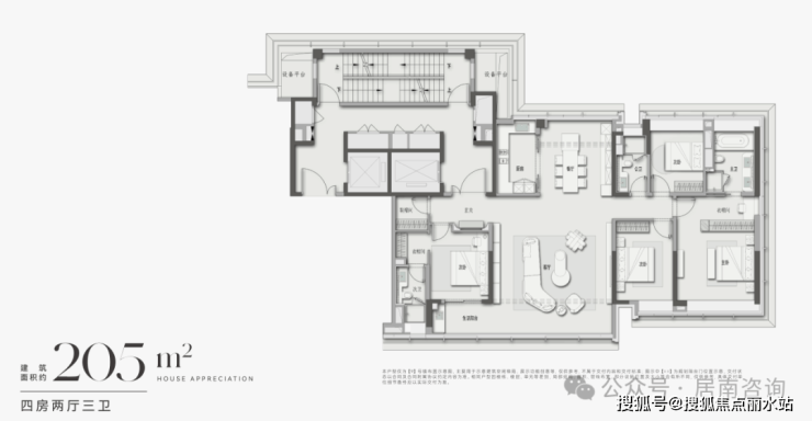建面约205㎡为四房设计,只为千万级精英家庭,值得一提的是,此户型是所有户型中性价比最高的,也是此次首开套数多的;