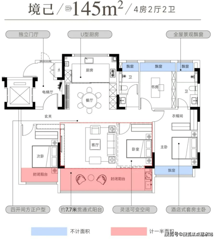 145㎡墅区洋房:四开间朝南,双联阳台封闭交付,赠送12㎡可变空间,65%业主规划为12人烧烤区;U型厨房配备中西导台,满足多元烹饪需求。