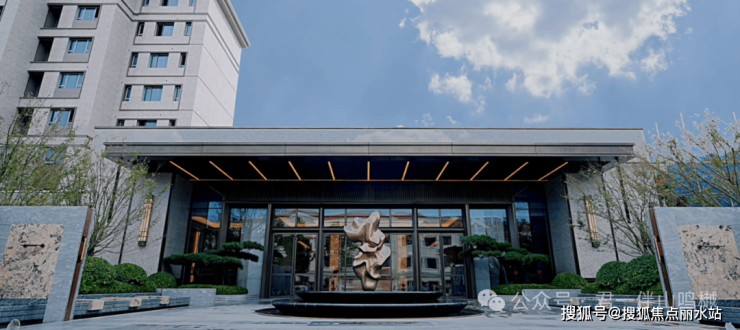 云岫门庭两侧30年树龄乌桕列阵和入口迎客松,寓意“长久、吉祥”,重塑归家第一重礼序;约3.8米高鸣樾廊桥,是崂山前海独树一帜廊桥景观;约5米林岚水瀑,取自郭熙《林泉高致》的高山流水,气势恢宏,气贯长虹。