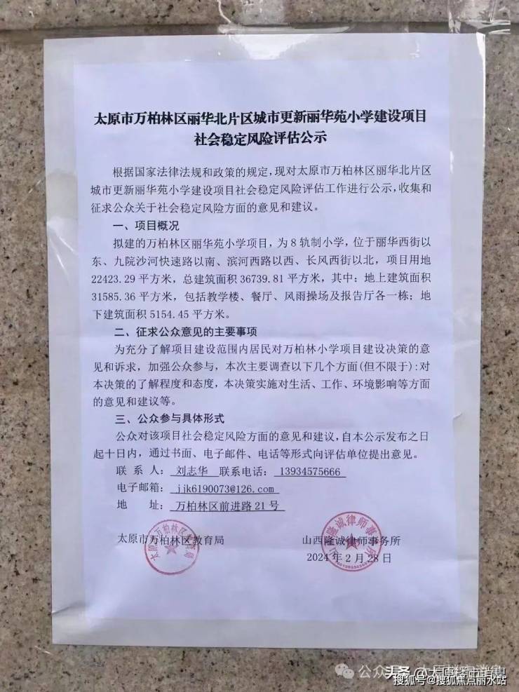 关于丽华教育园区2024年2月28日消息,丽华苑周边小区现场贴的,关于万柏林区教育局的风评公示,说明小学即将开始建设了。