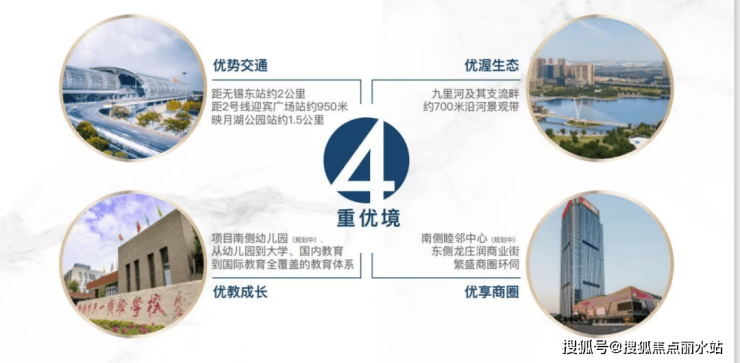 距无锡东站约2公里,地铁2号线迎宾广场站约950米,映月湖公园站约1.5公里。距离无锡东出口及通锡高速约4km,新华路、金城路高架通达全城,高浪路及机场路通达硕放机场。形成集高铁、地铁、高速、高架、机场为一体的五维立体交通网络。