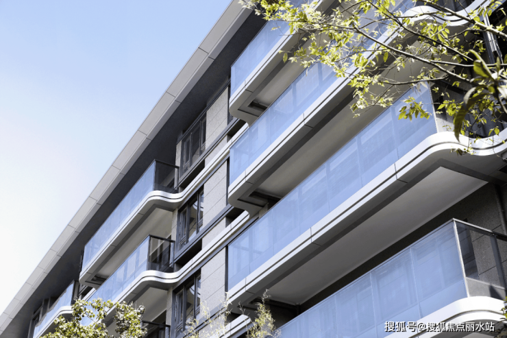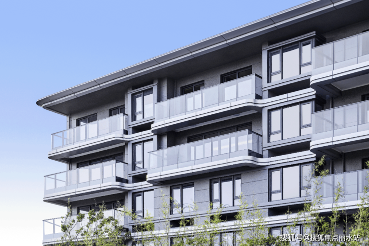 铂悦溪上的外立面,主材为铝板,搭配石材、部分涂料和阳台落地玻璃,极限窗墙比的建筑立面,当目光与之触及一瞬,给人眼前一亮的感觉,颇有辨识度。