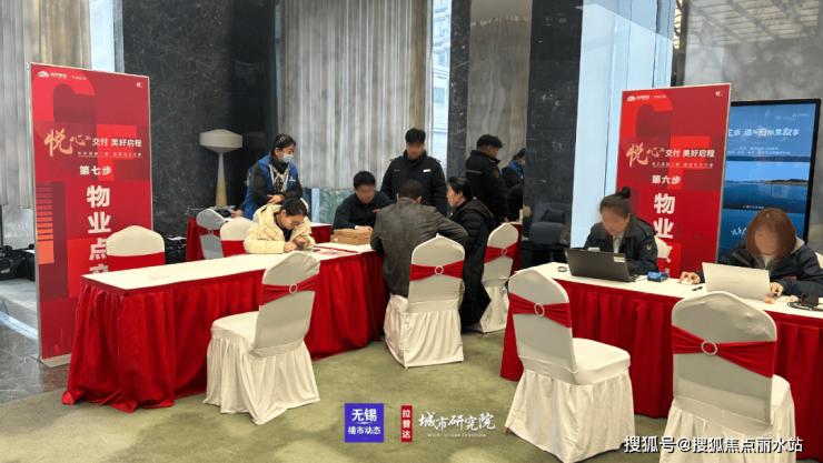 今天交付现场仪式感十足,现场设置了地产结算区、物业交付区、验房区等。
