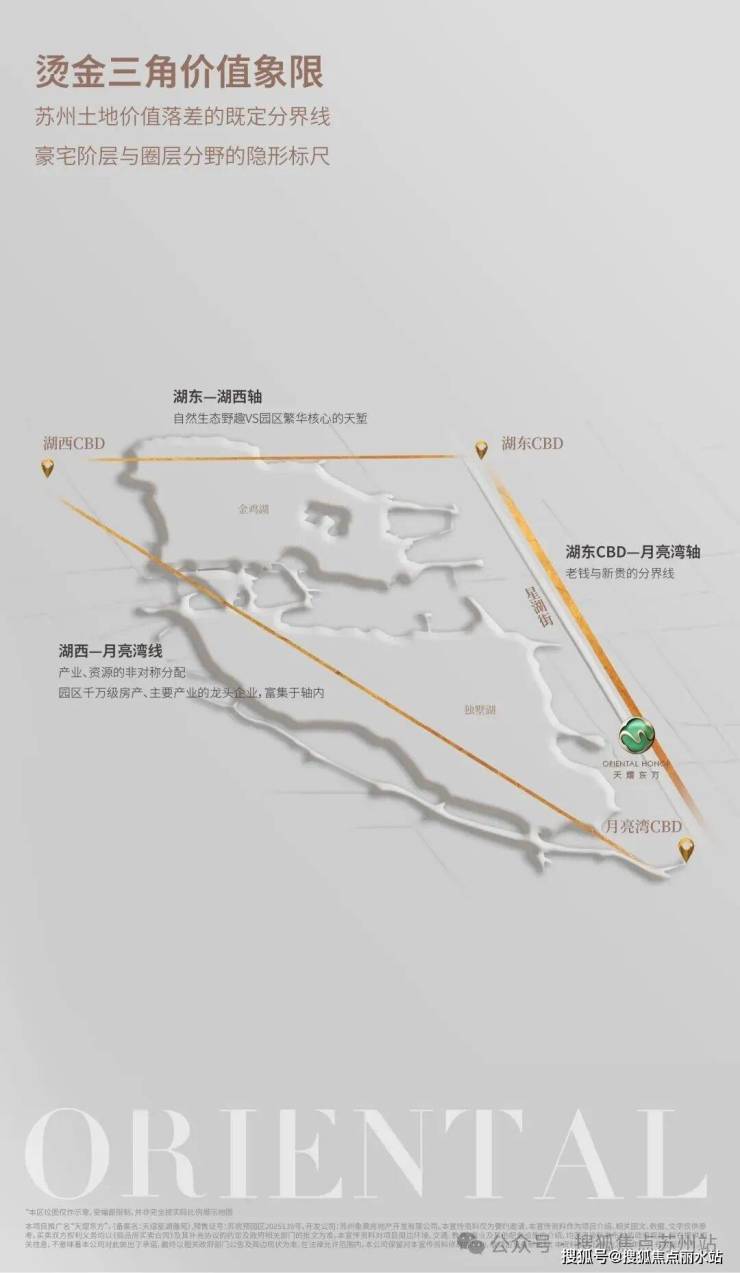 黄金三角的三条边,是苏州城市价值的等高线,更是圈层分野的隐形标尺。湖东—湖西轴如同园区“长安街”,串联东方之门到国际博览中心,南北一轴之隔便有千万价差鸿沟;湖东CBD—月亮湾轴沿星湖街延伸,轴内代表老牌权贵与金融资本,越近双湖资产越保值;湖西—月亮湾线则是“资源动脉”,串联苏州中心、月亮湾和独墅湖高教区,集中了园区80%的优质资源,轴内外资源呈断层式差距。三角之内是苏州豪门俱乐部,三角之外仅是高端改善,天熠东方正处大双湖CBD的C位,占据着无可复制的核心地段。