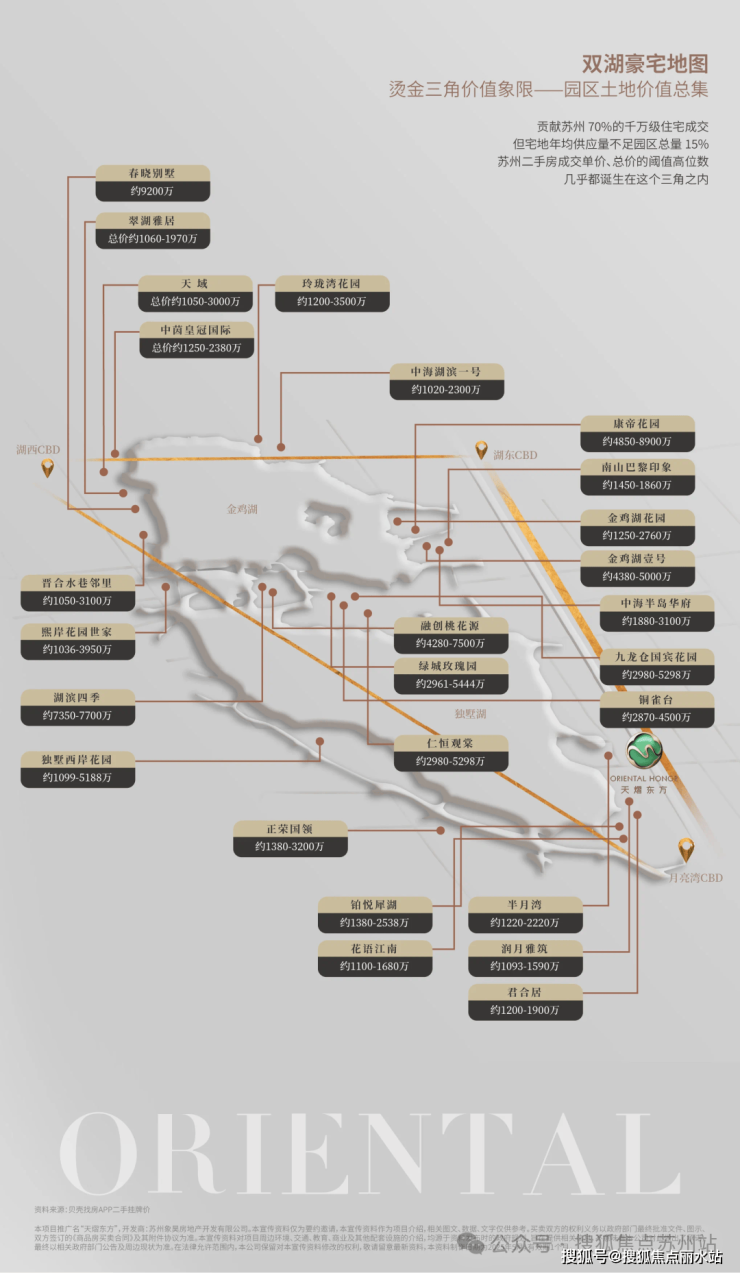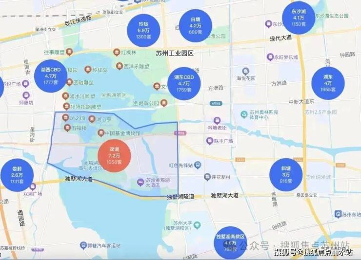 苏州豪宅的价值基因,始终与双湖板块深度捆绑。园区作为苏州房价高地,而双湖板块更是高地中的顶点,“园区最贵,双湖为王”早已成为楼市共识。由湖西CBD、湖东CBD和月亮湾CBD组成的“双湖黄金三角”,更是这片价值高地的核心,框住了苏州70%的头部豪宅,堪称园区30年发展的价值总集。