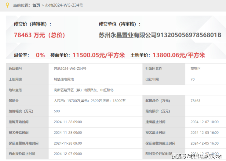 绿城兴贤澜颂,即苏地2024-WG-Z34号地块,位于高新区经开区(镇)鸿禄路东、中虹路北,是2024年12月7日,苏州永昌置业有限公司以底价78463万元竞得,成交楼面价11500元/平。
