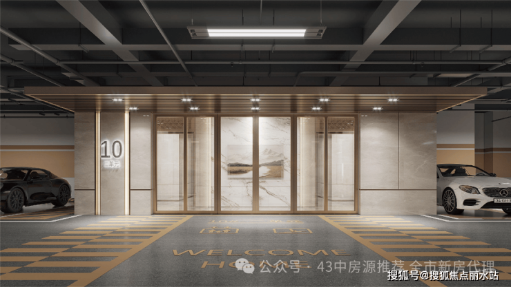 【车库大堂】采用高标准的精装标准,瓷砖与岩板结合,金属线条装饰,搭配射灯,辉煌明亮。
