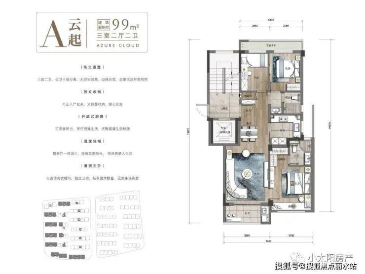 ①建面约99㎡洋房,入户设置多个玄关收纳柜,增强收纳;U型厨房的开合优化,更利于家人的情感沟通;卫浴做到干湿分离;宽敞的餐客厅可以随时切换为“家庭活动中心”,通透的格局,将全家人的理想生活完美串连。