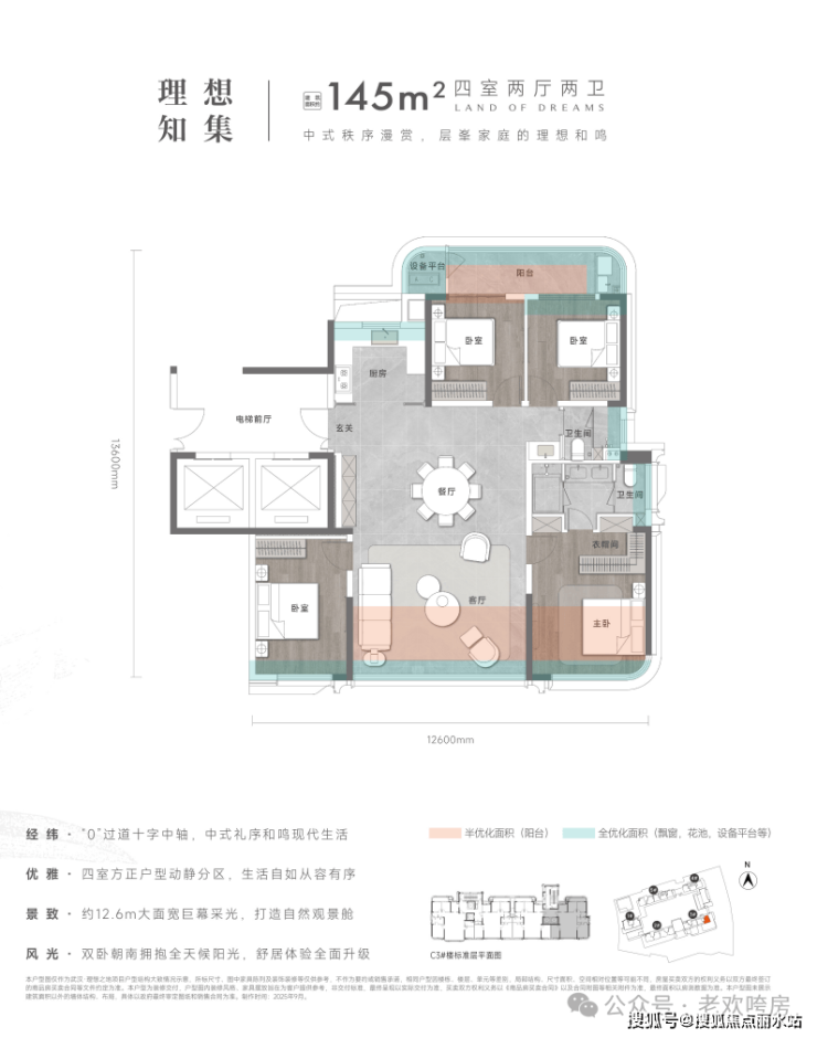 建面约145㎡的四房两厅两卫户型,走的是“平衡高效” 路线。