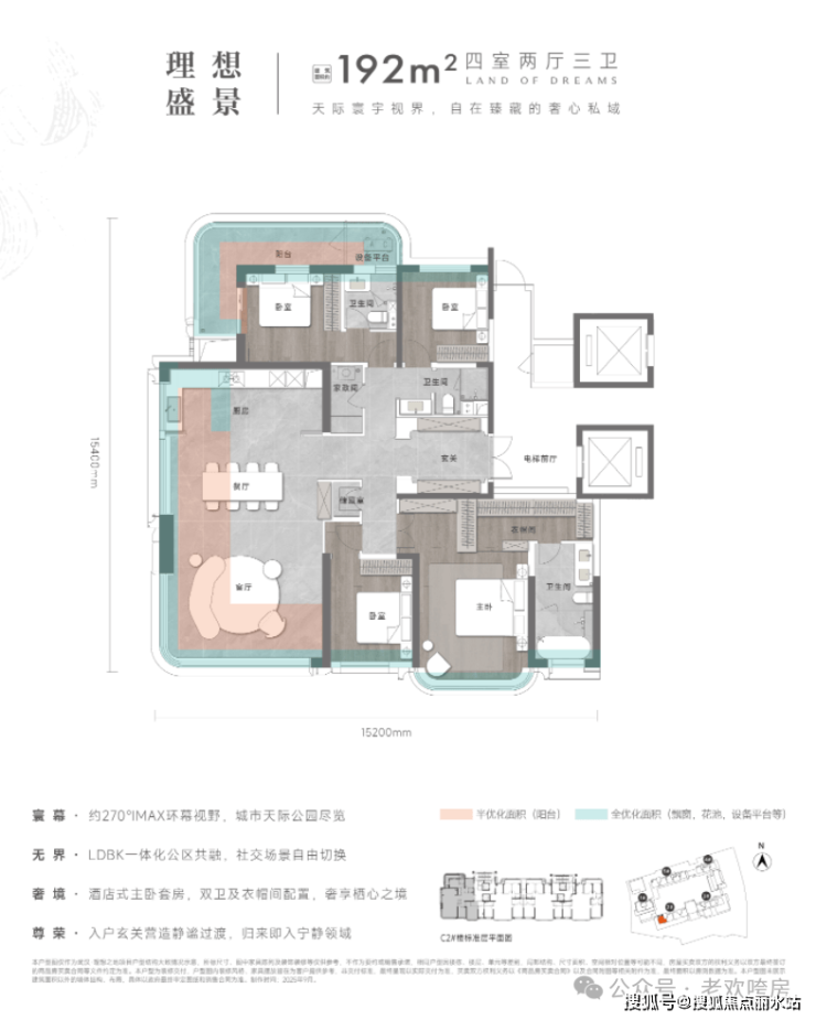 四开间朝南,南向面宽达15.2米,同样LDKB 一体化设计,社交空间更开阔,更有约270°IMAX环幕视野,城市天际公园尽揽,
