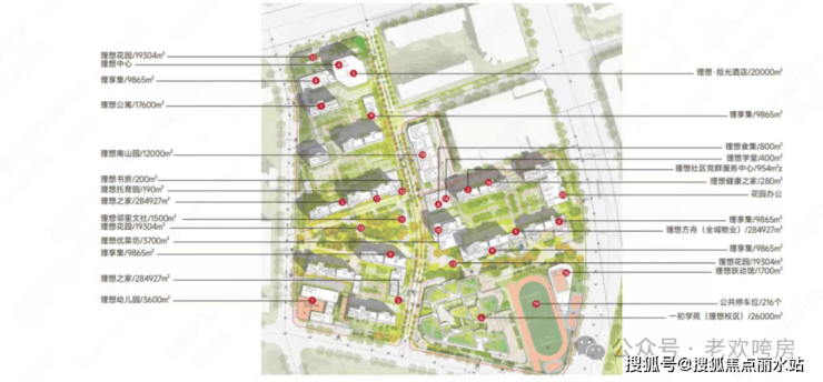 从规划图中可知,项目共包含13栋住宅、1栋写字楼、一所42 班九年一贯制学校、一所12 班幼儿园,还有运动场、康养中心、活力商业…… 连书店、食堂、优菜坊、运动场、健康之家都配齐了。