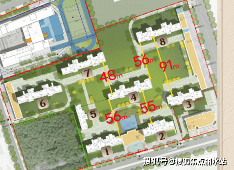 通过项目平面图可以看到,多数楼栋间距都在50米以上,最大楼间距能达到约91米。