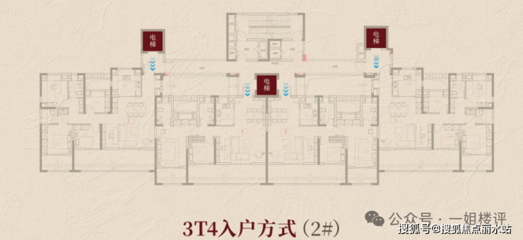 2号楼则是三梯四户结构,东西两边的户型都是独立电梯入户,中间电梯管2户,也是通过电梯双开门设计,实现独立入户的舒适体验。