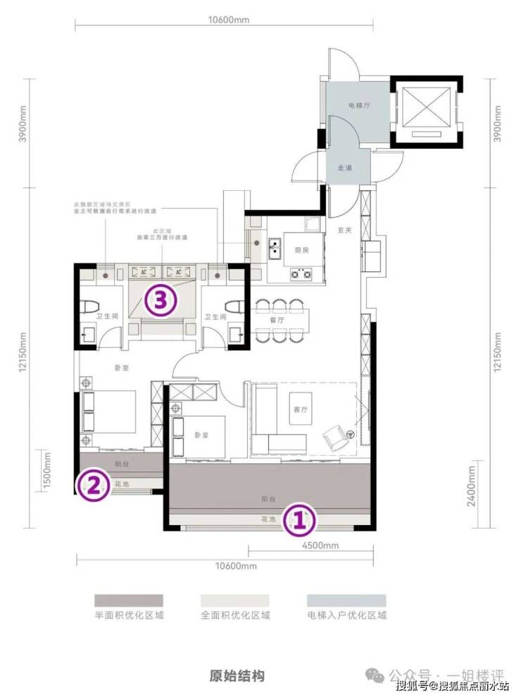 多数准四代楼盘仅有阳台和飘窗可以优化面积。但是,城投红树林南侧阳台外面还有花池,北侧也有大面积设备平台优化空间,这三处优化面积是很多楼盘做不到的。因此,不算电梯前室,仅室内优化面积就基本能抵消公摊面积。