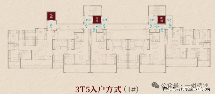 其中1号楼是三梯五户的结构,西边的边户独立电梯入户。中间和东侧两个电梯各管2户,通过双开门电梯形成不同的归家动线,实现不同户型独立入户的舒适体验。
