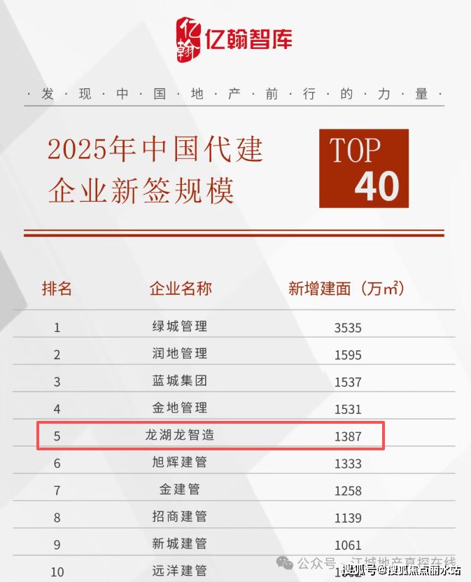 作为代建行业的新生力量,龙湖龙智造用三年多的时间快速崛起,在行业内闯出一片天地。根据亿翰智库发布的《2025年中国代建企业新签规模》,龙湖龙智造以新增建面1387万方位居第五。