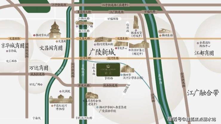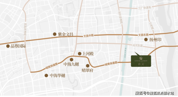 文昌·启元项目择址广陵城芯,运河沿岸。文昌路和城南快速路一北一南,双轴交辉。