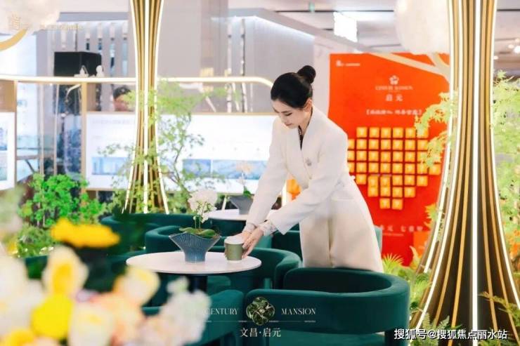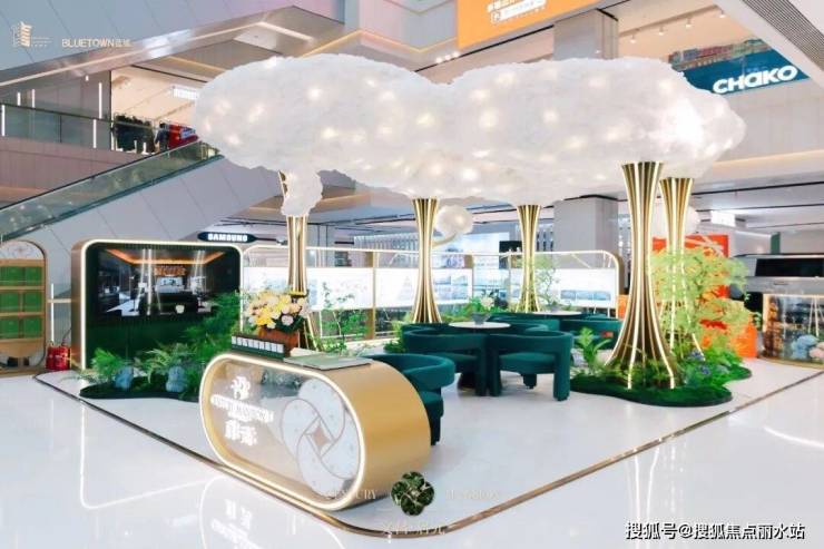 公开现场,悬浮的云朵、伸展的绿树、围合式的绿色沙发与圆桌……处处彰显着文昌·启元在品质和审美上的高级感。