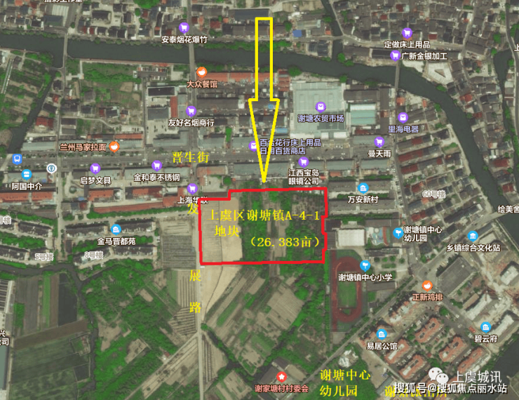该地块位于上虞区谢塘镇,东至谢塘镇中心小学围墙,南至规划道路,西至发展路,北至拟建停车场。