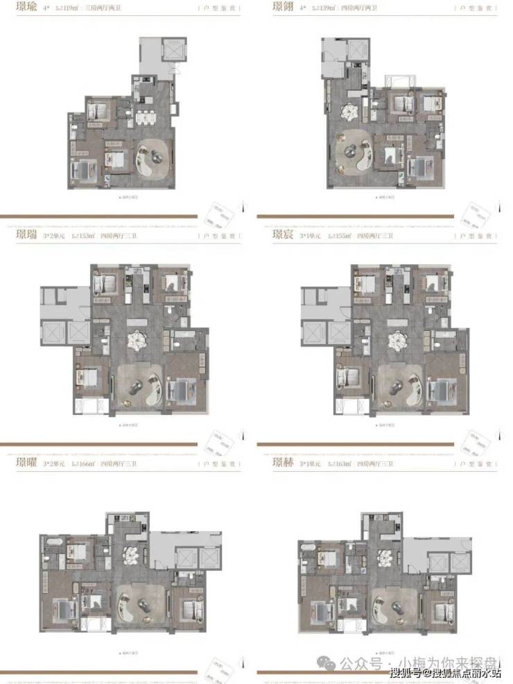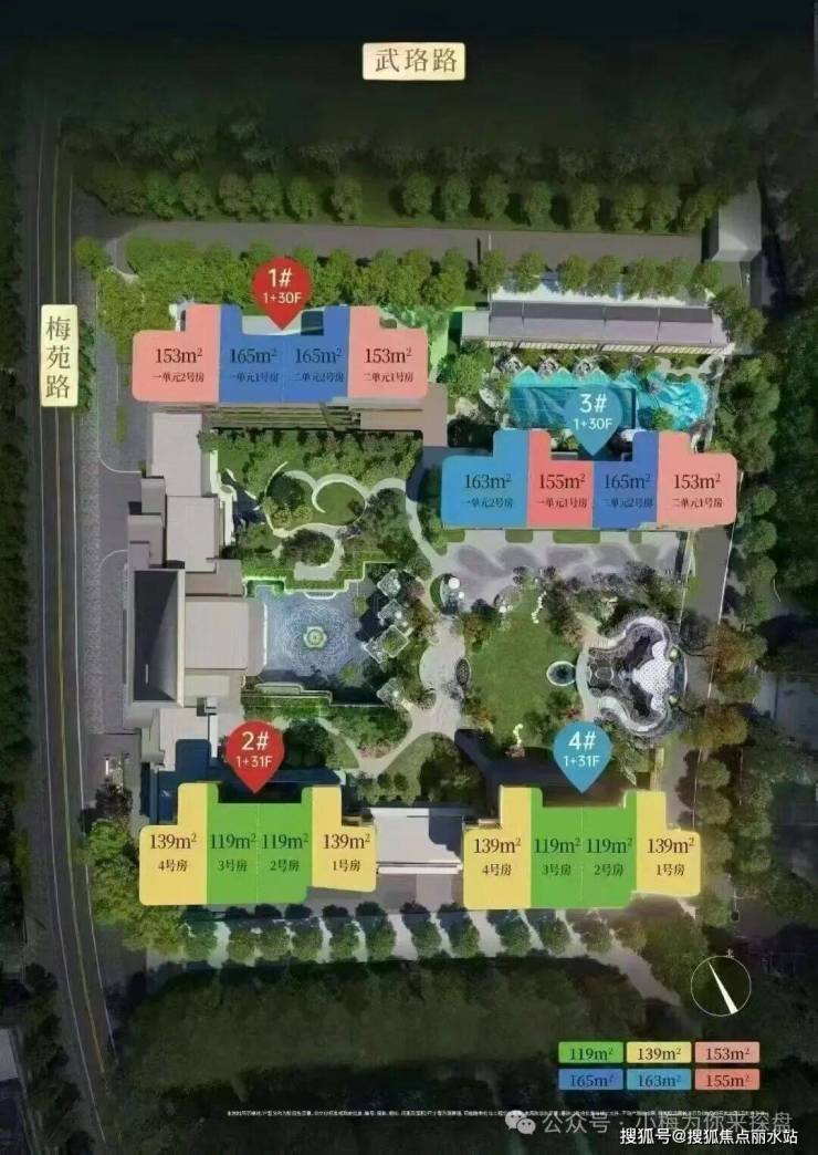 建发璟玥一共488套,119的一共124套,139的一共124套,153的一共120套,165的一共120套。梯户比:1号楼和3号楼是31层,层高3.15米,2梯2梯,2个单元,153和165平米。2号楼和4号楼是32层,层高3.05米,3梯4户,119和139平米。面积段为119,139,153,165四个面积段。