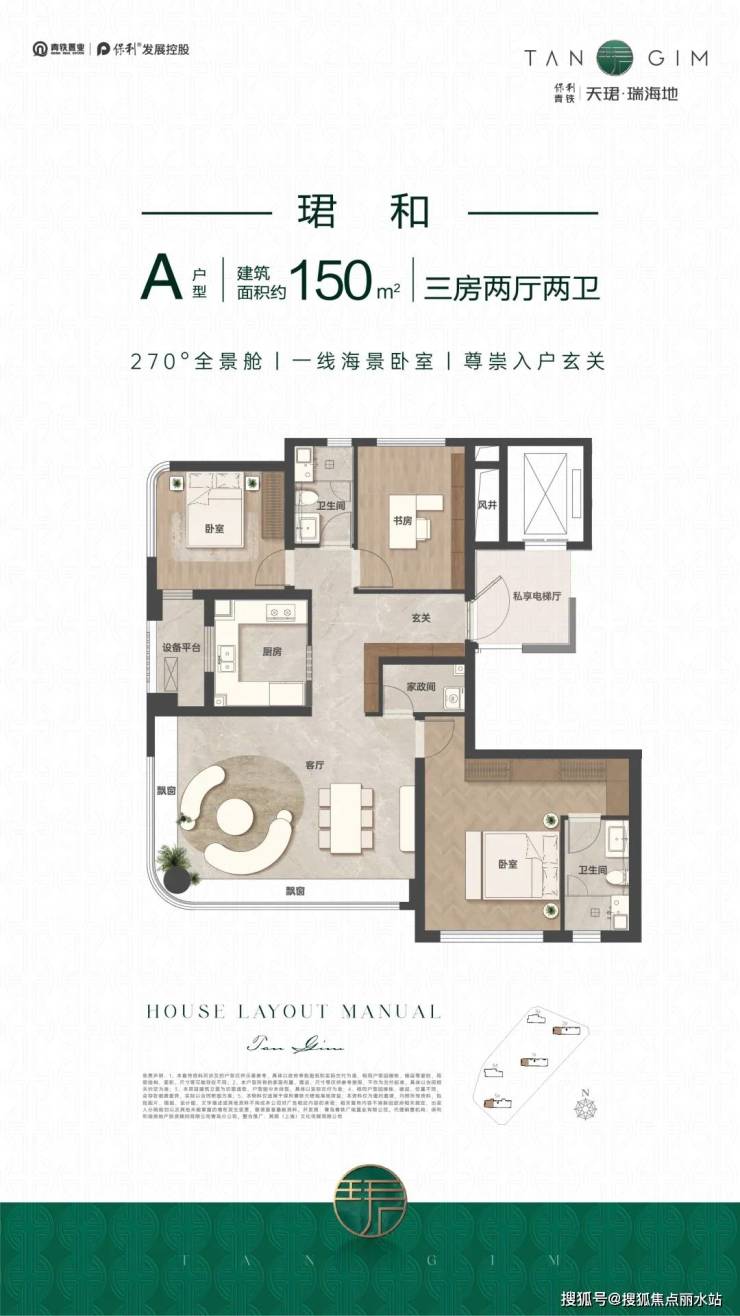 150平西户,拥有三大“杀器”:三面采光,超大观景客厅;西侧瞰海景观卧室,270°环幕玻璃;南向奢阔主卧套房,独立衣帽空间。