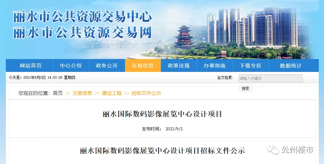 前天,丽水市公共资源交易网发布了招标文件《丽水国际数码影像展览中心设计项目》。